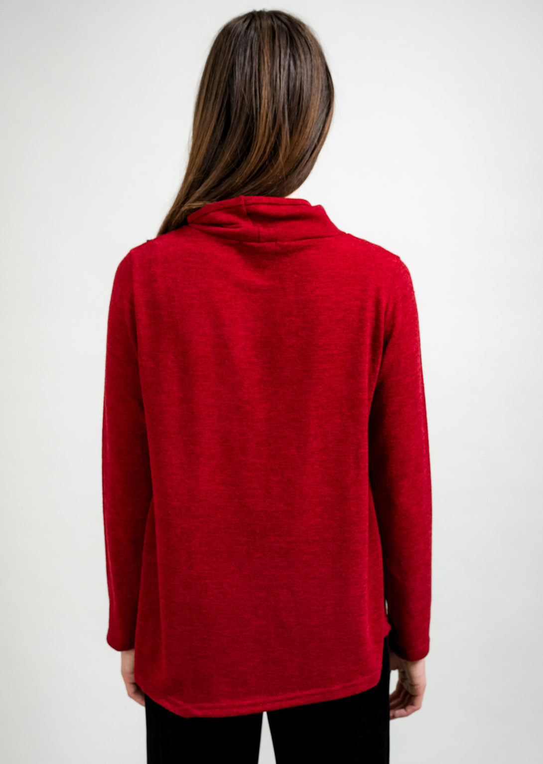 Elevate your everyday style with this chic funnel neck top, designed with a striking contrast embroidered pattern that elongates and flatters the silhouette. The rich hue pairs beautifully with the bold linear embroidery, creating a modern yet timeless look. Crafted from a soft, breathable knit, it offers both comfort and effortless sophistication. Perfect for pairing with tailored pants or denim, this piece is a versatile addition to your wardrobe that transitions seamlessly from day to evening.