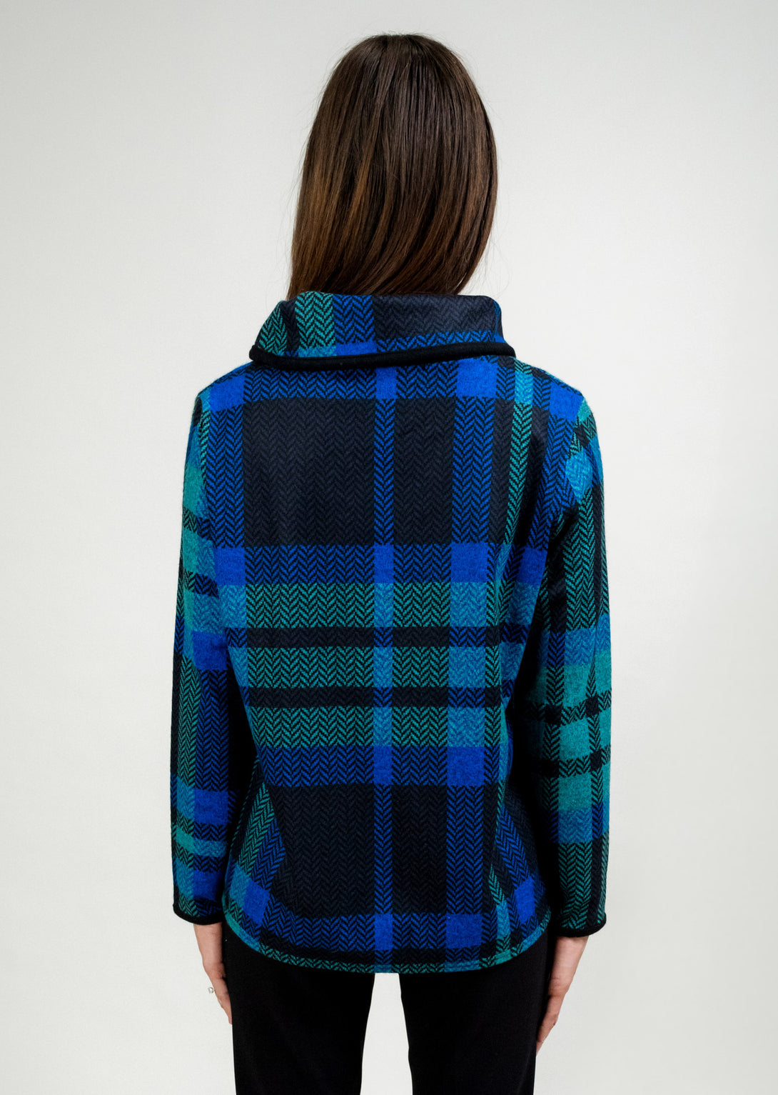 CONTRAST TRIM FOLD OVER NECK PLAID PRINTED SWEATER