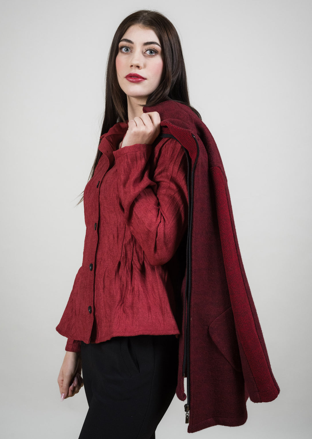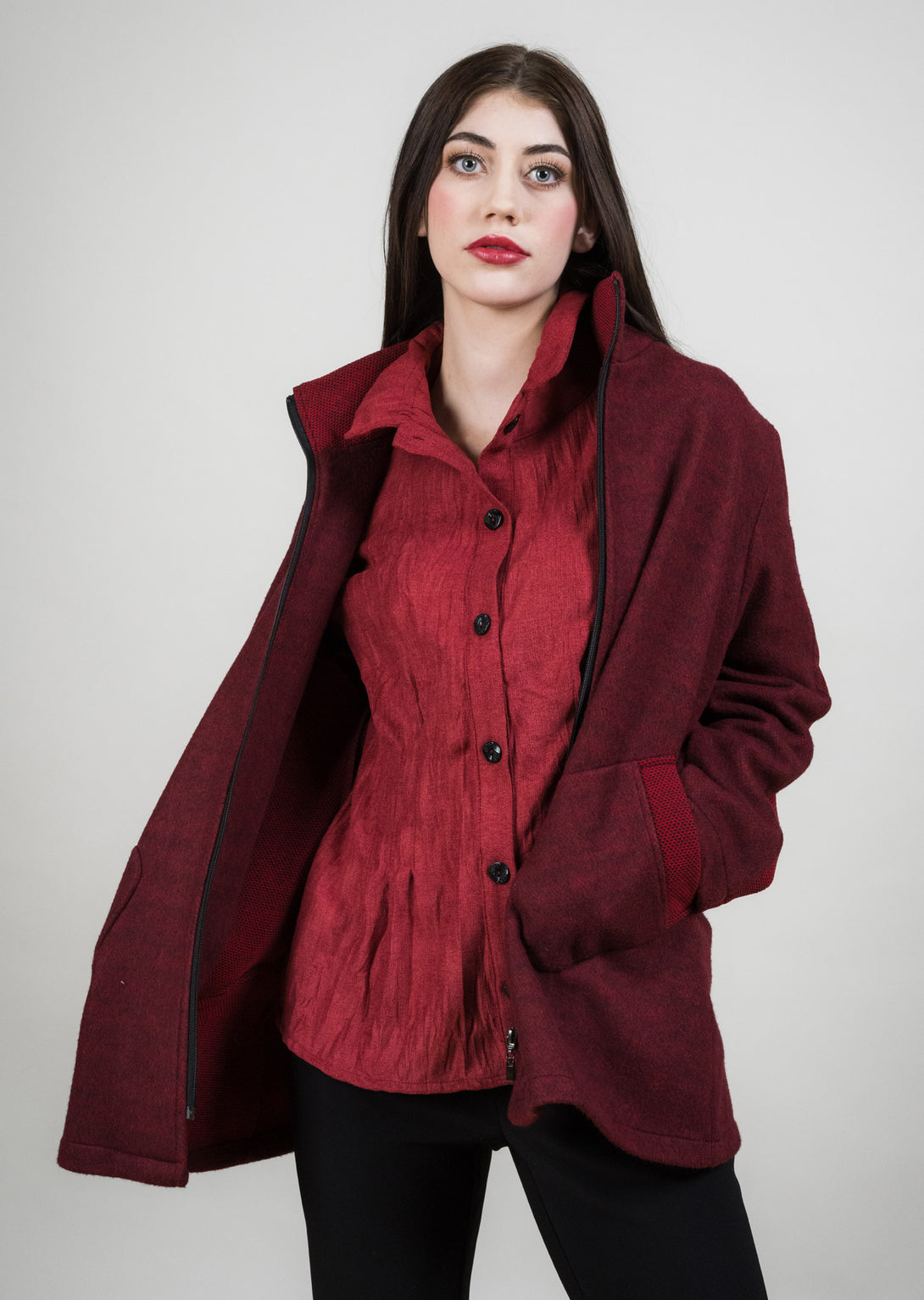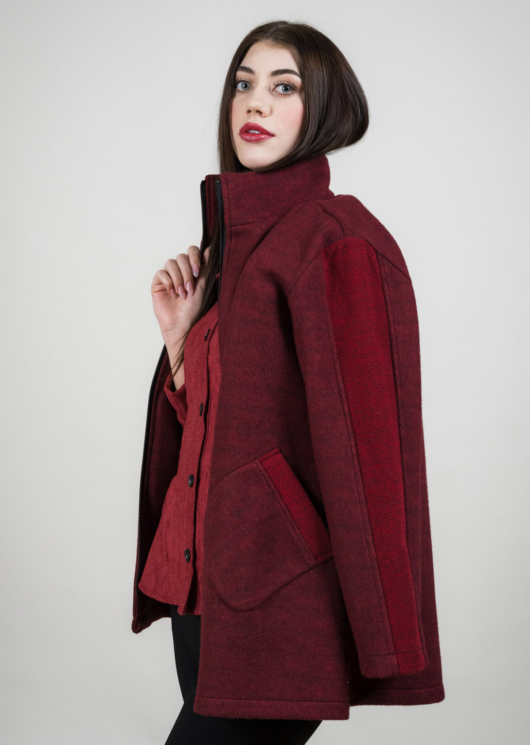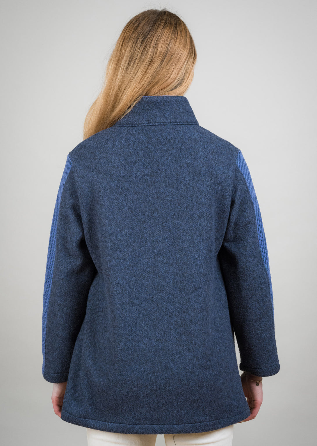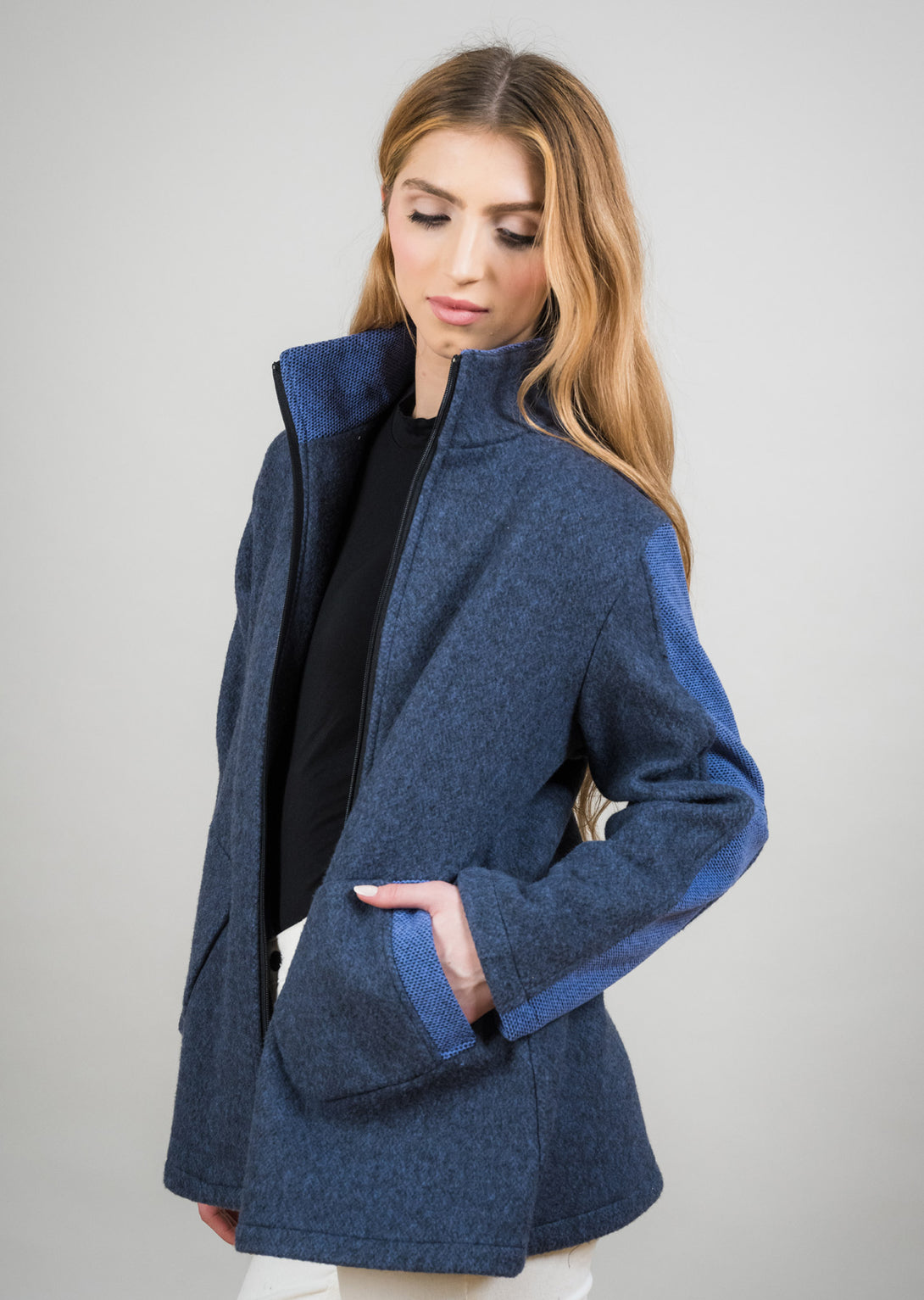 The Contrast Panel Sleeve Coat blends modern design with timeless versatility. Crafted in a soft blue wool-blend, it features a structured silhouette with a zip-front closure and practical patch pockets. The contrasting textured panels along the sleeves and trim elevate the look with a subtle yet striking detail. Effortlessly chic and endlessly wearable, this coat transitions seamlessly from casual outings to polished occasions.